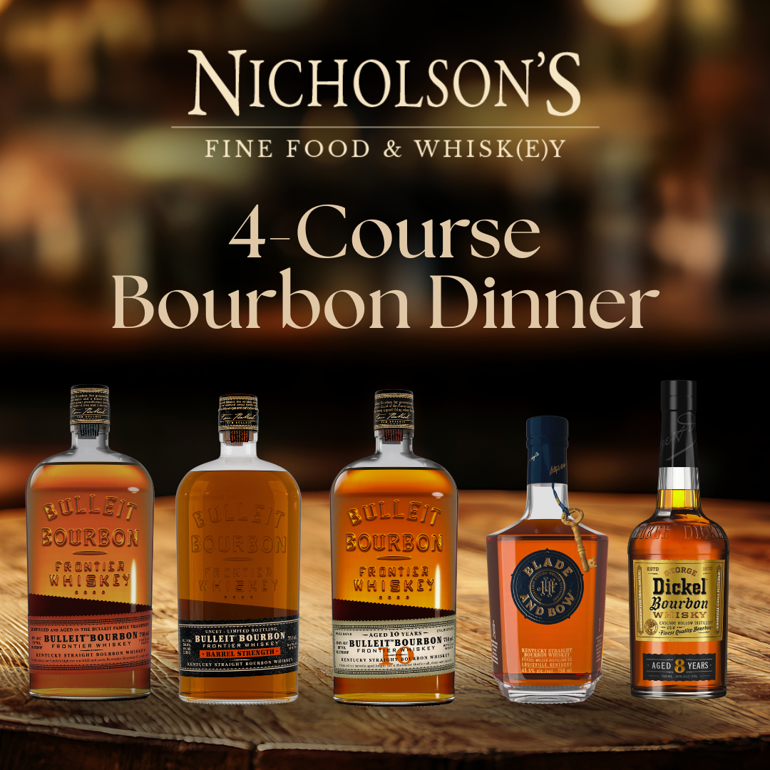 The perfect pairing: Nicholson’s culinary excellence meets the high-rye spice and complex flavors of delicious bourbon with featured brands including Bulleit, George Dickel, and Blade & Bow. A truly exceptional 4-course journey.