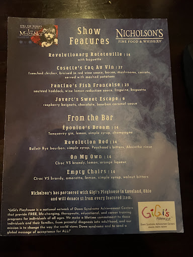 Fantastic atmosphere, great service and unbelievable food! My family and I love to go to Nicholson's before our Broadway in Cincinnati shows at the Aronoff. They are conveniently located across from the Aronoff Theater and they create special menu choices based on the broadway show performing. I highly recommend Nicholson's for anyone looking to try something new and for those of us that can't get enough of it. - 9/15/2025